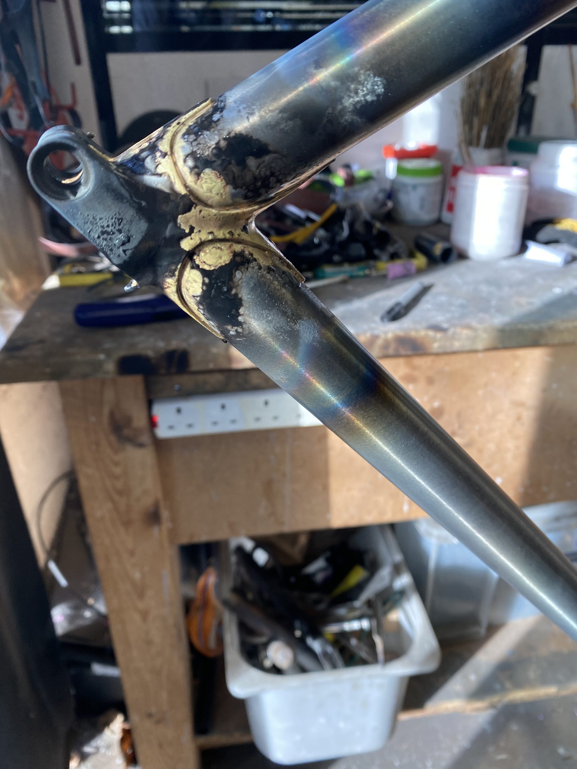 The first job was brazing the bottom bracket. Rob started off and I did some of it. Lots of heat to get the bottom bracket shell up to temperature then a fair bit of brass to flow into the joint and come out of the bottom. All the way around the tube joints then a second round to re-flow any big blobs of brass either into the joint or to somewhere where it’s easy to get rid of as it’s too difficult to file into the tight spaces. We then did the top and bottom head tube lugs and finally the seat lug. Some of the tangs needed tapping in.