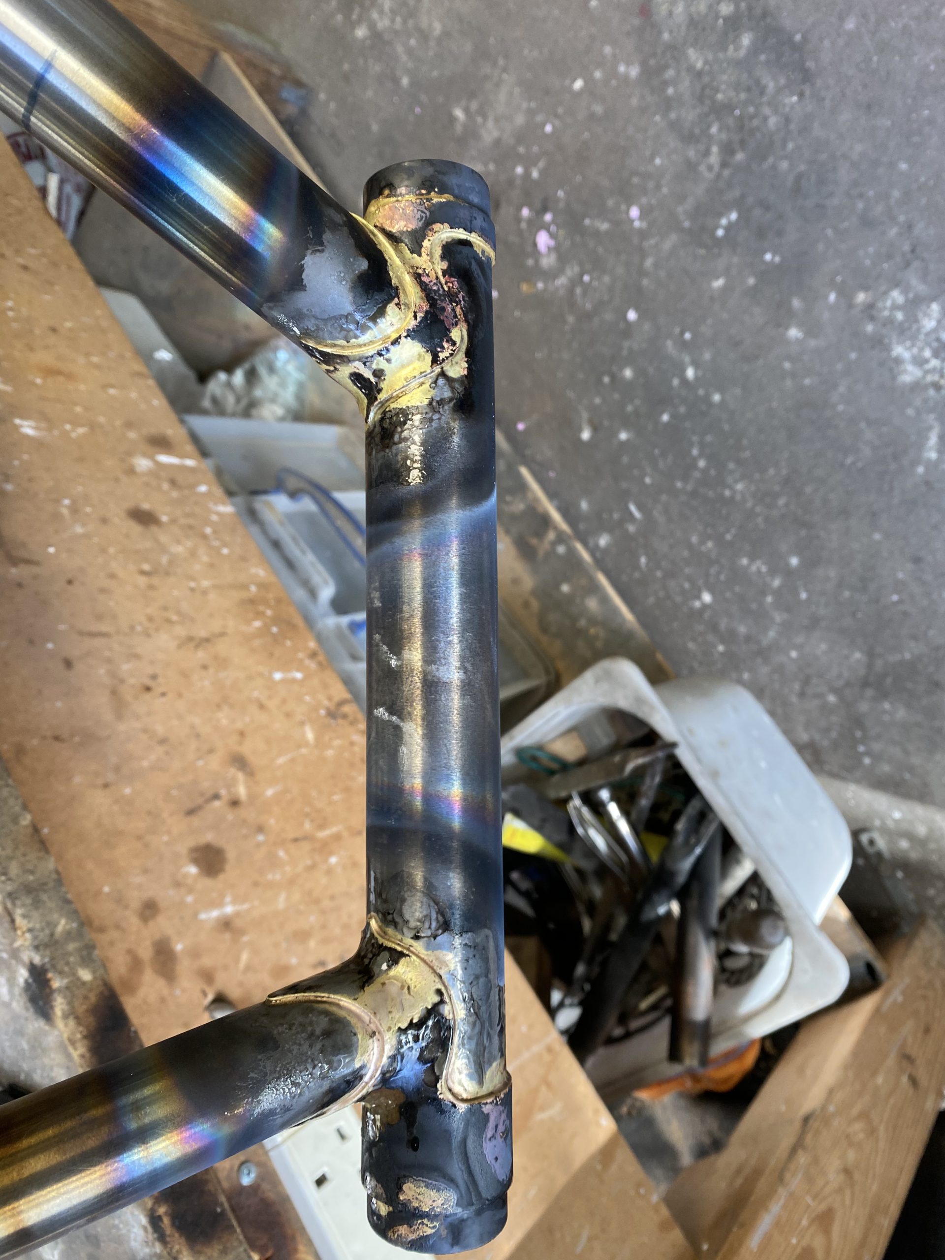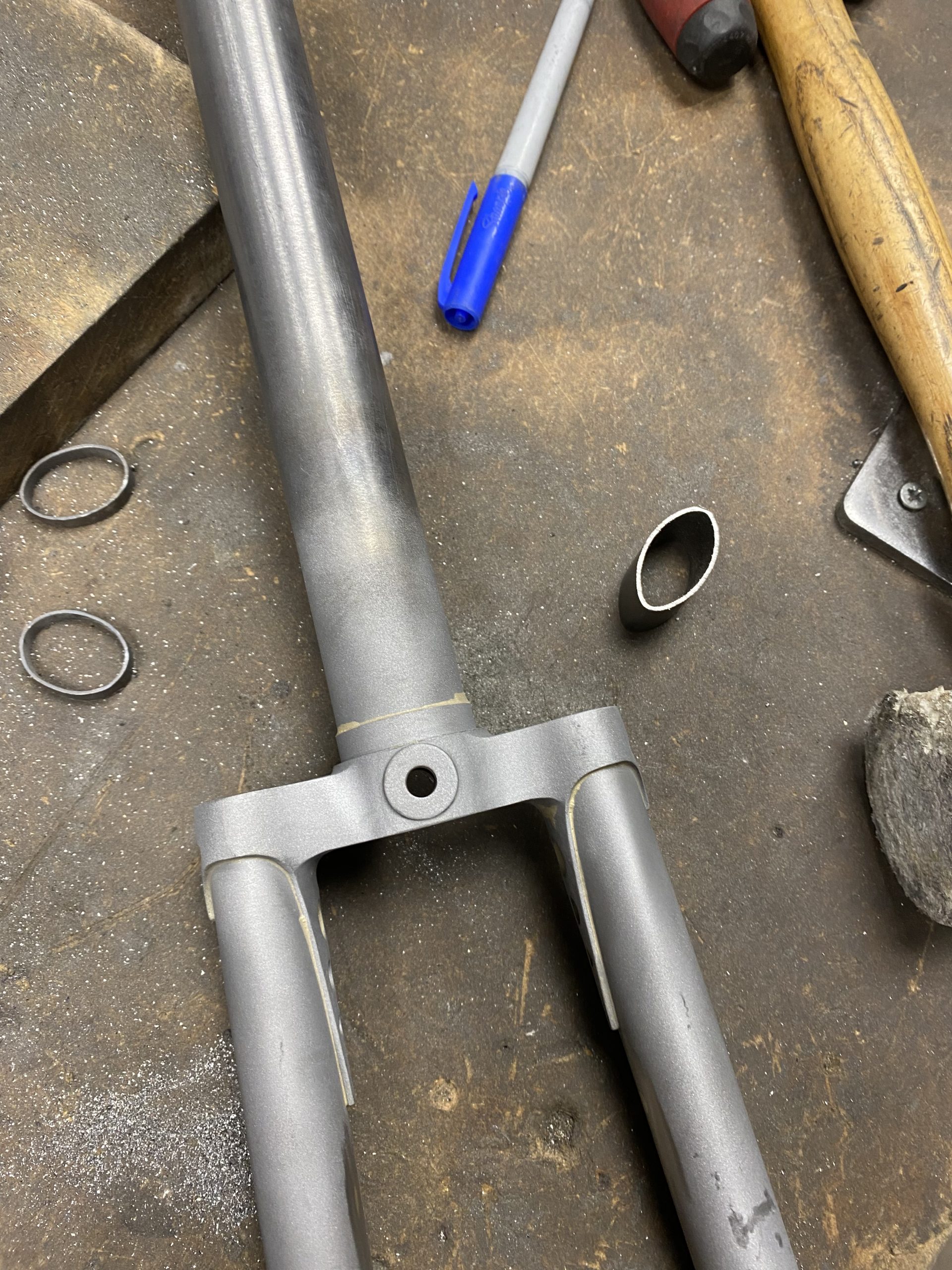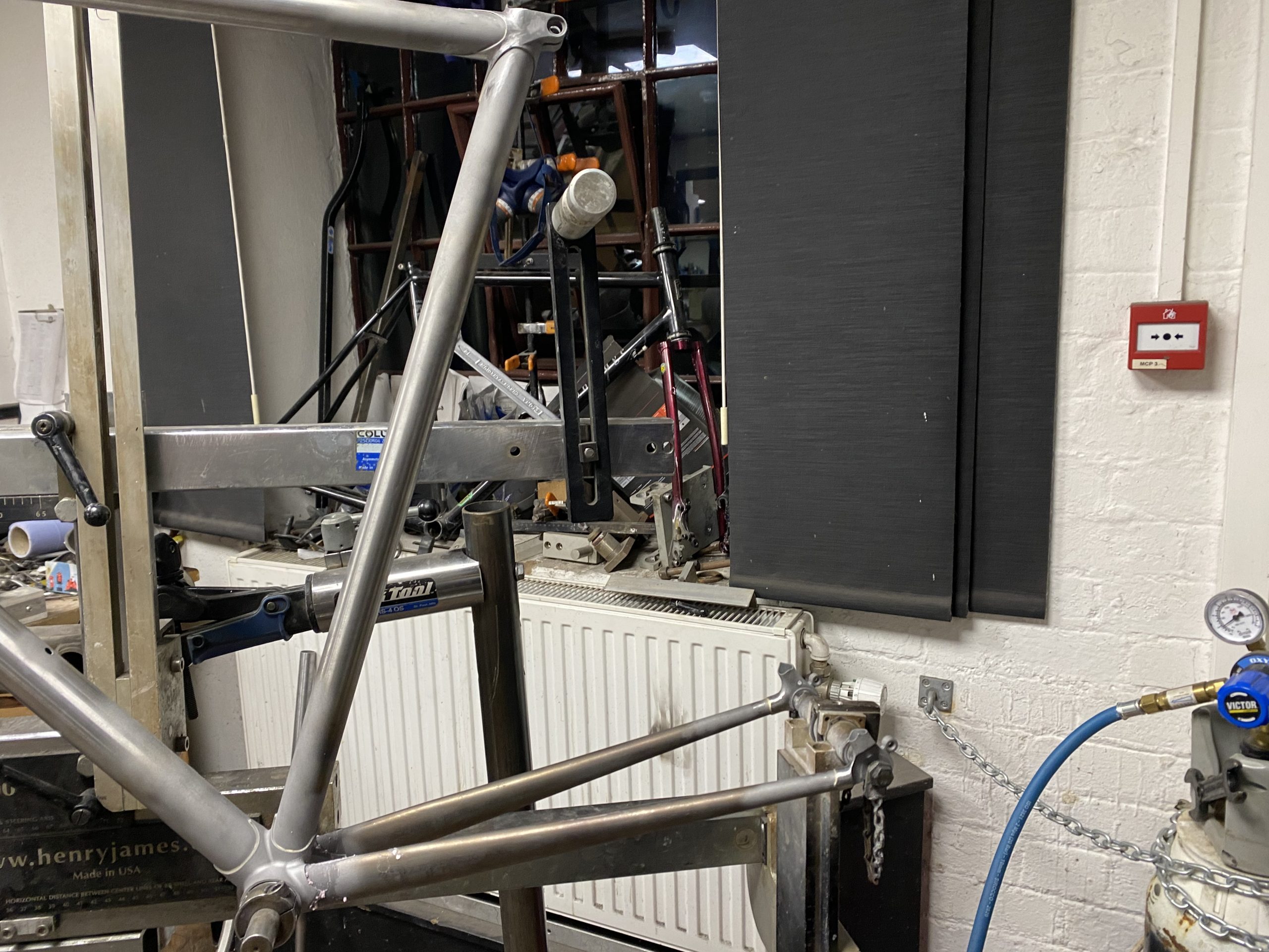 We put the frame back on the jig and measured for the chain stays. I cut them down about 20mm and then we could put them into the bottom bracket, track them and mark for mitres. I cut and filed the mitres and fluxed and prepped for brazing. We didn’t quite get to the brazing so I tidied up the forks instead.