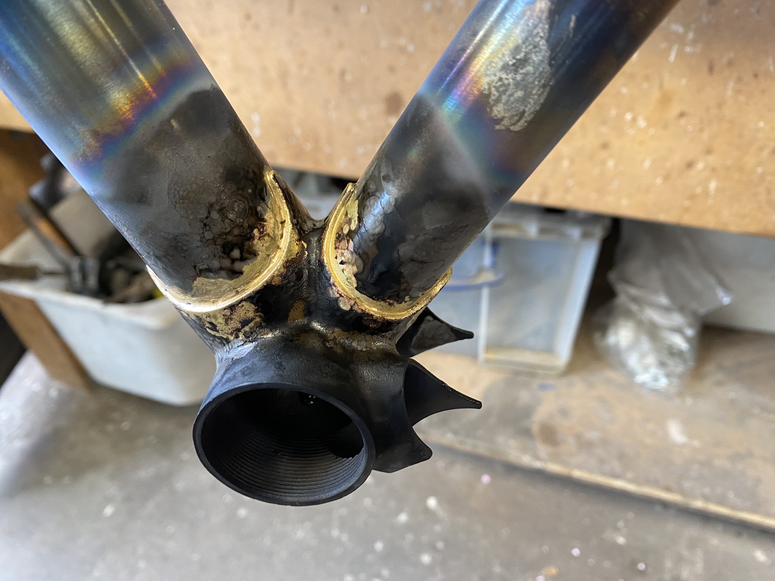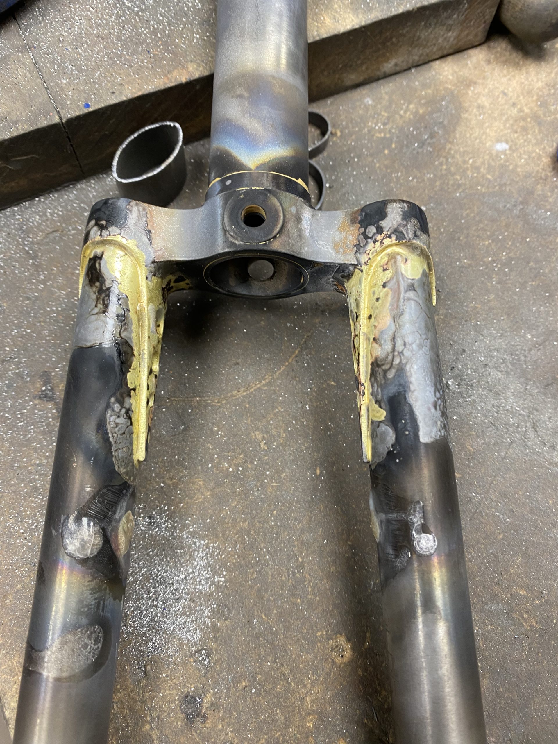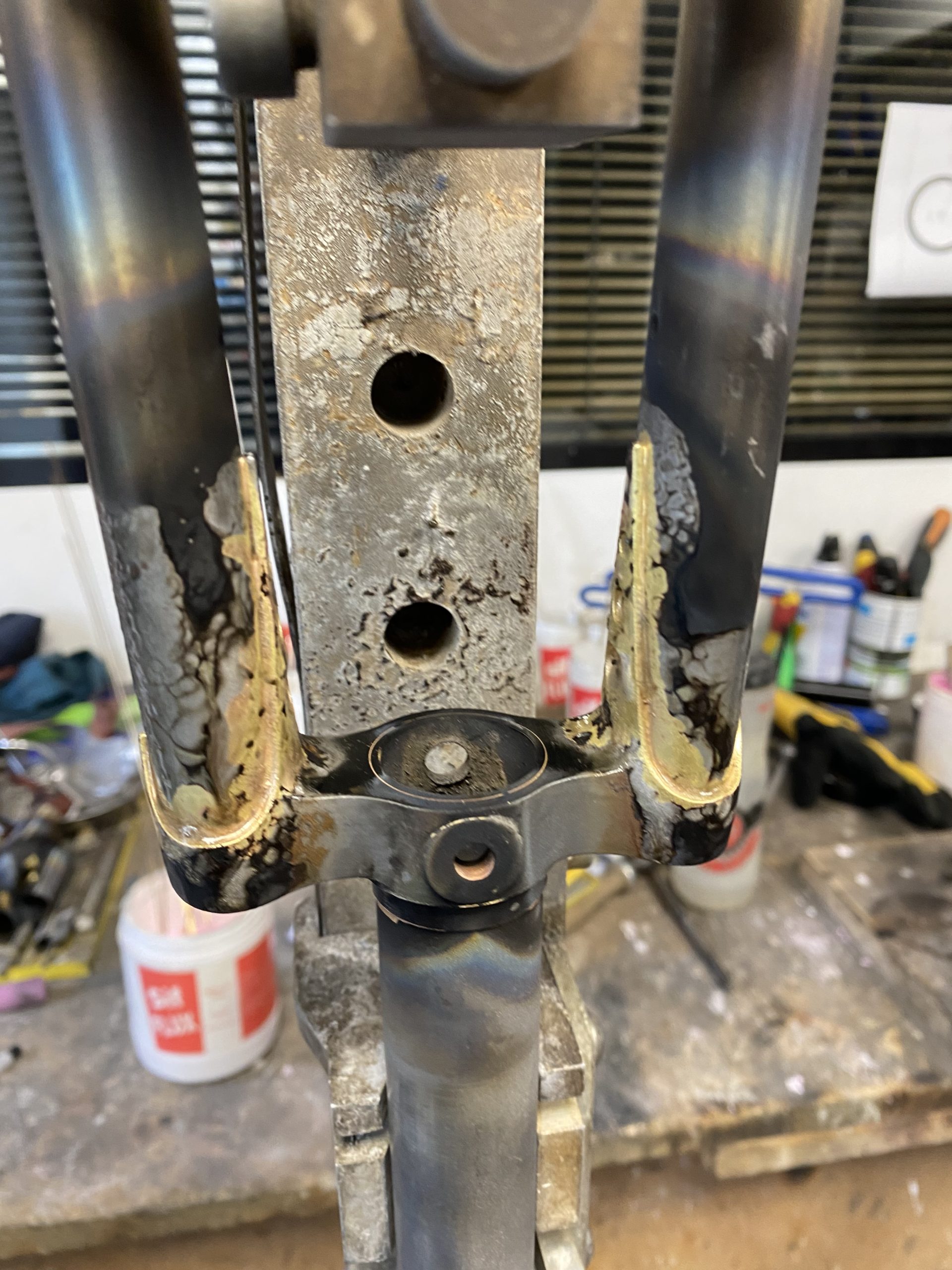 The last job for the morning was cutting the fork blades to size and then brazing them into the fork crown. Again lots of heat to get the fork crown up to temperature.