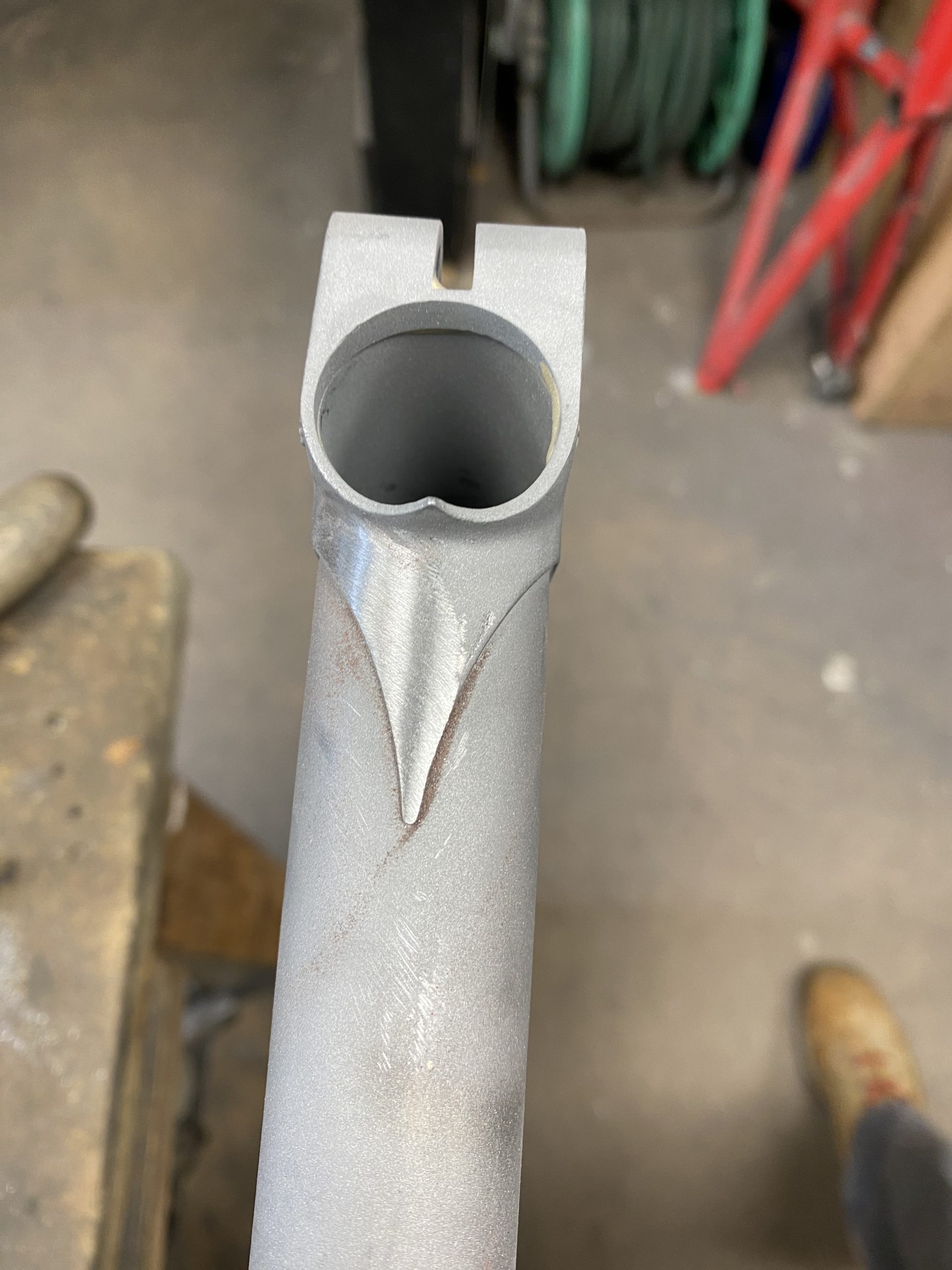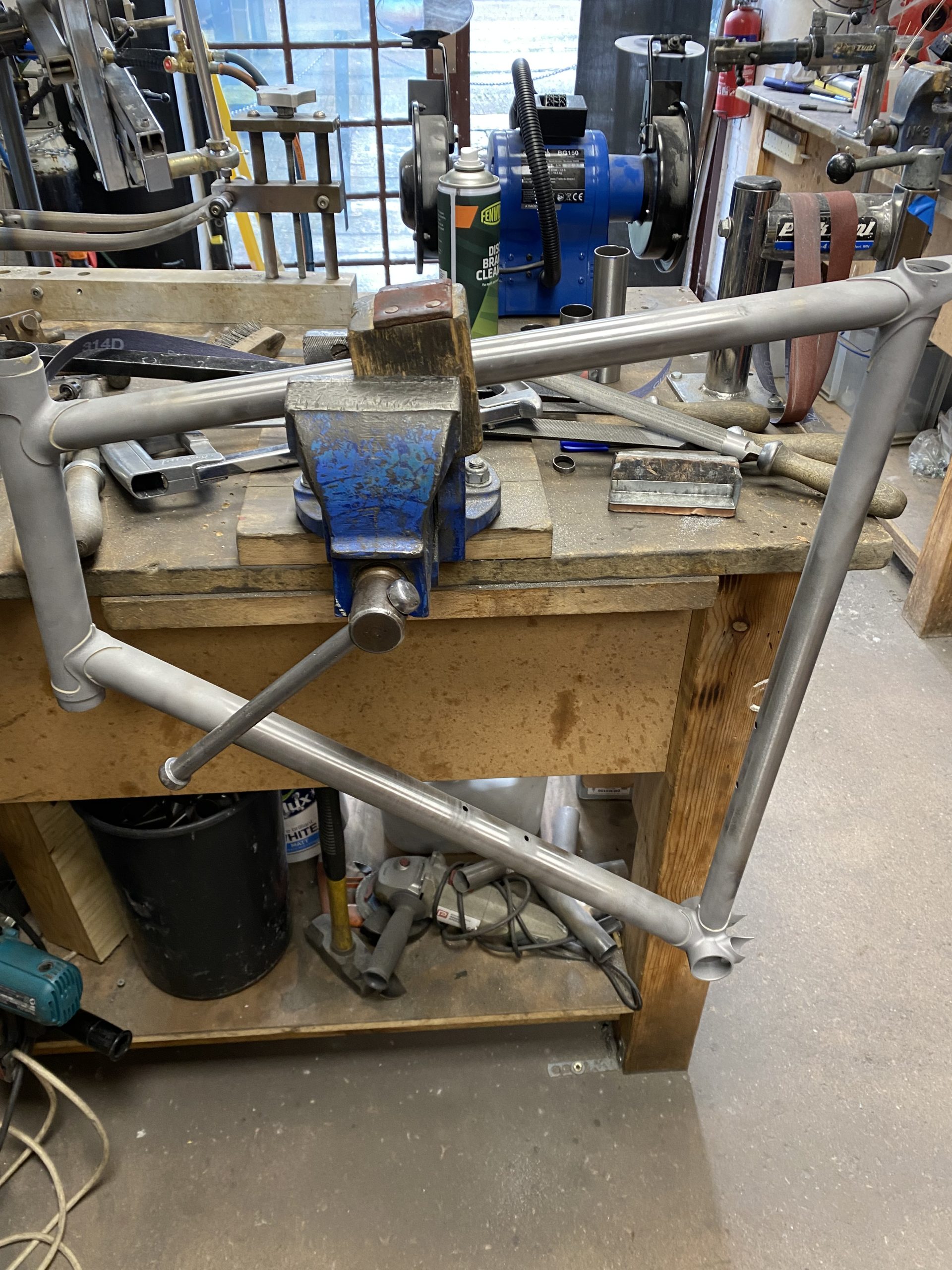 That took us up to lunch time. The first part of the afternoon was tidying up the main frame in the media blaster and followed by filing the lugs to remove any hammer marks from adjustment and to taper the tangs down to the frame tubes. I also removed the casting marks and generally tidied up. Finishing off with emery.