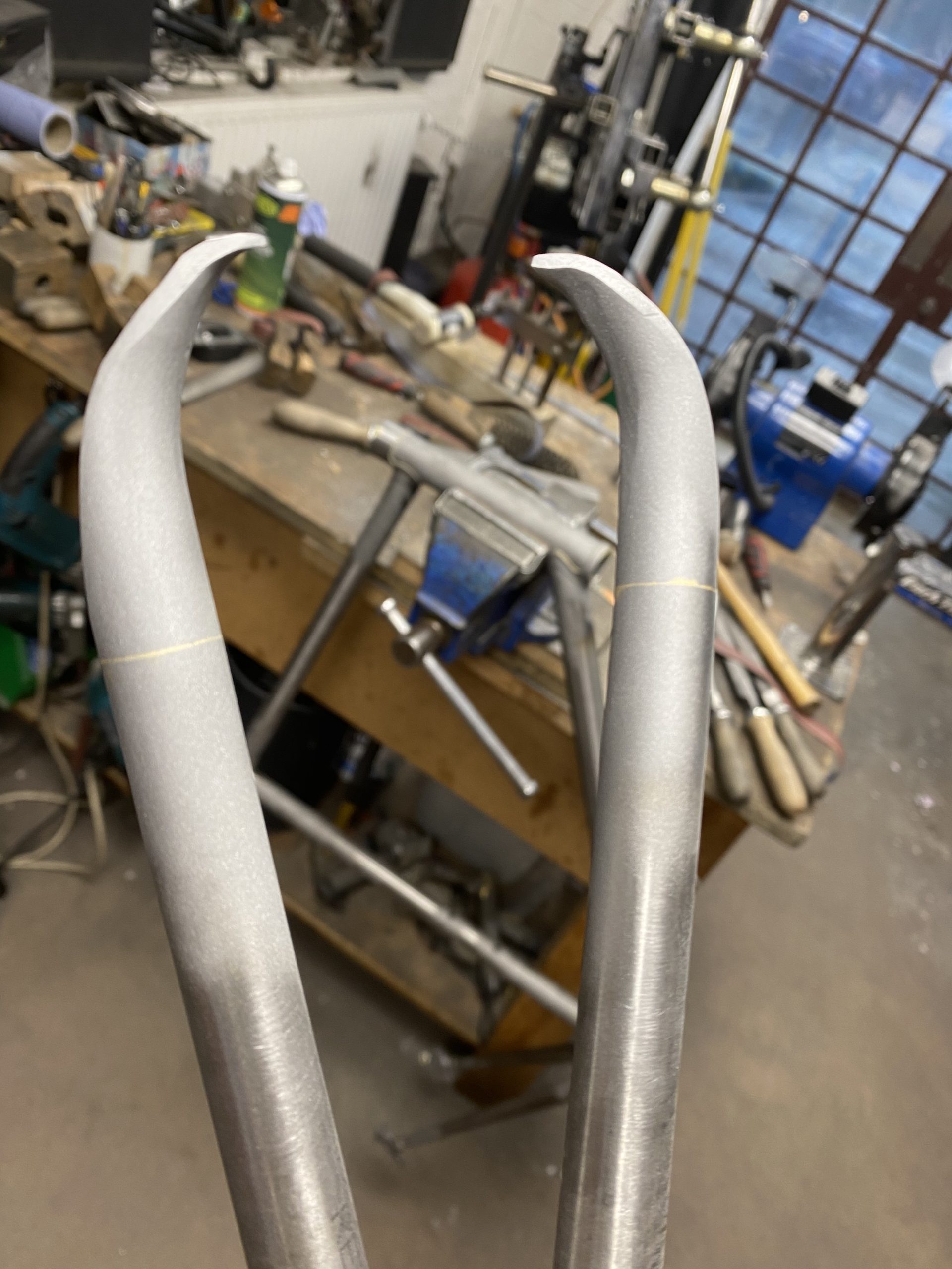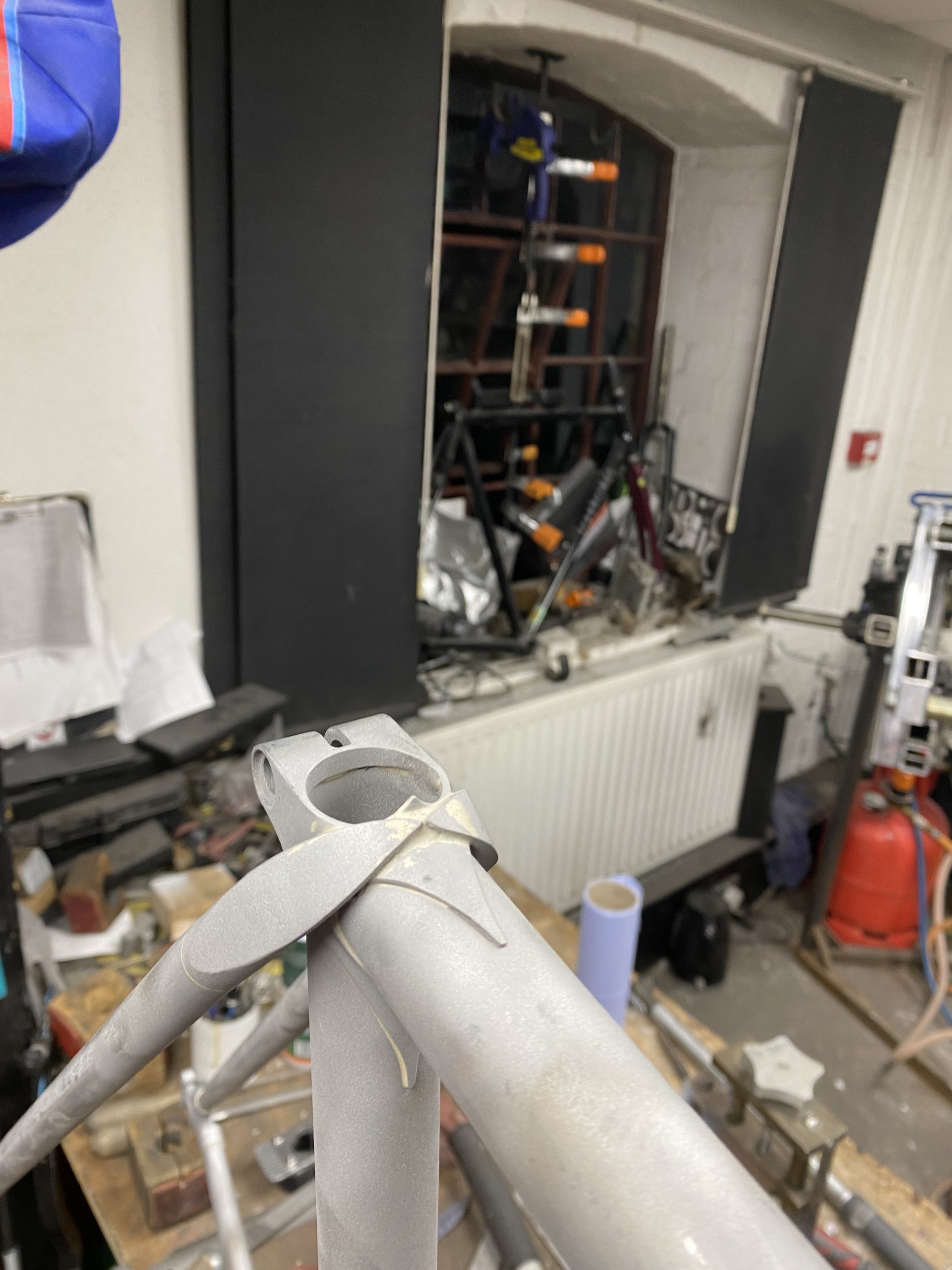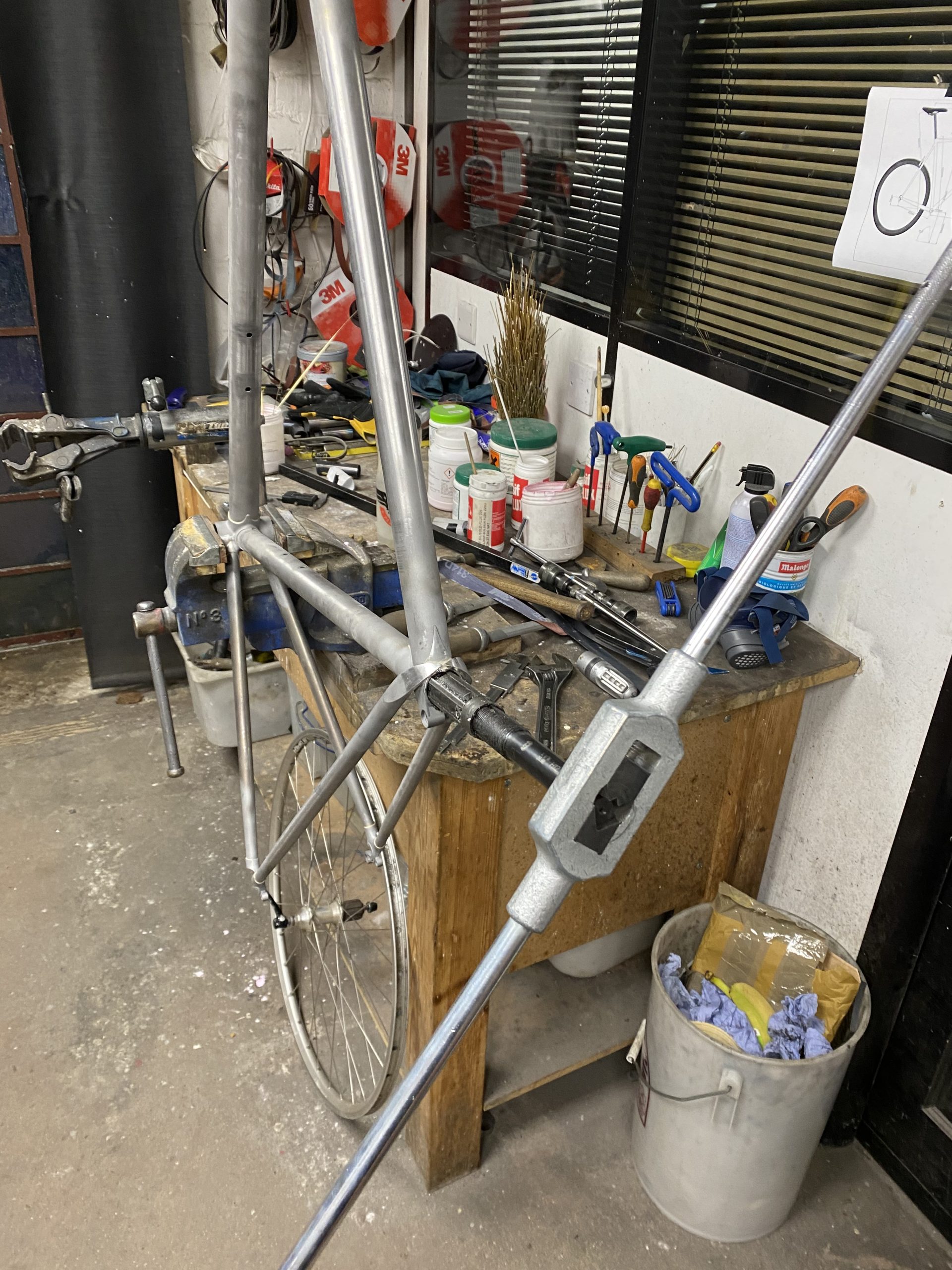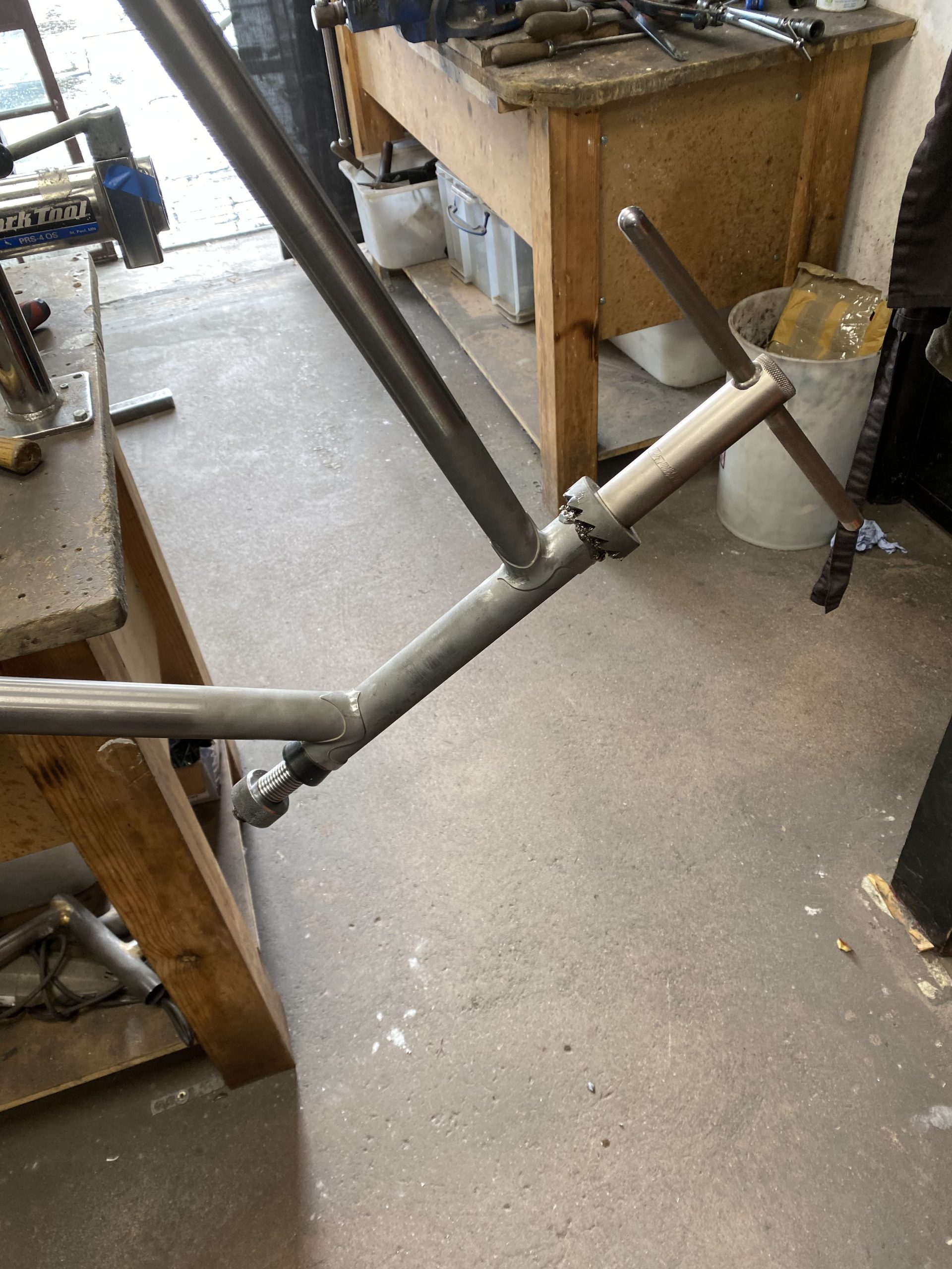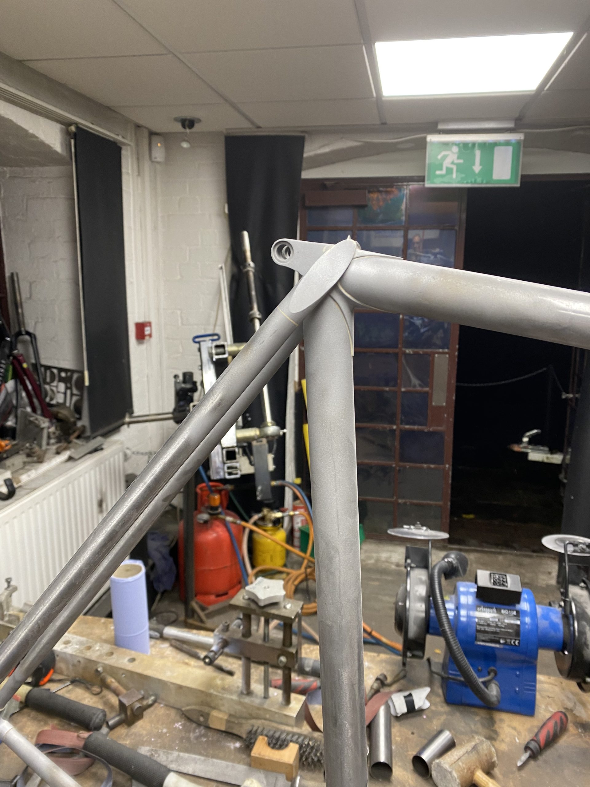 Rob tracked the rear triangle and we brazed the non drive side seat stay at the bottom to the dropout, checked tracking again and then the drive side seat stay at the bottom. I cleaned up in the blast cabinet and it’s getting quite difficult getting the frame in there now.